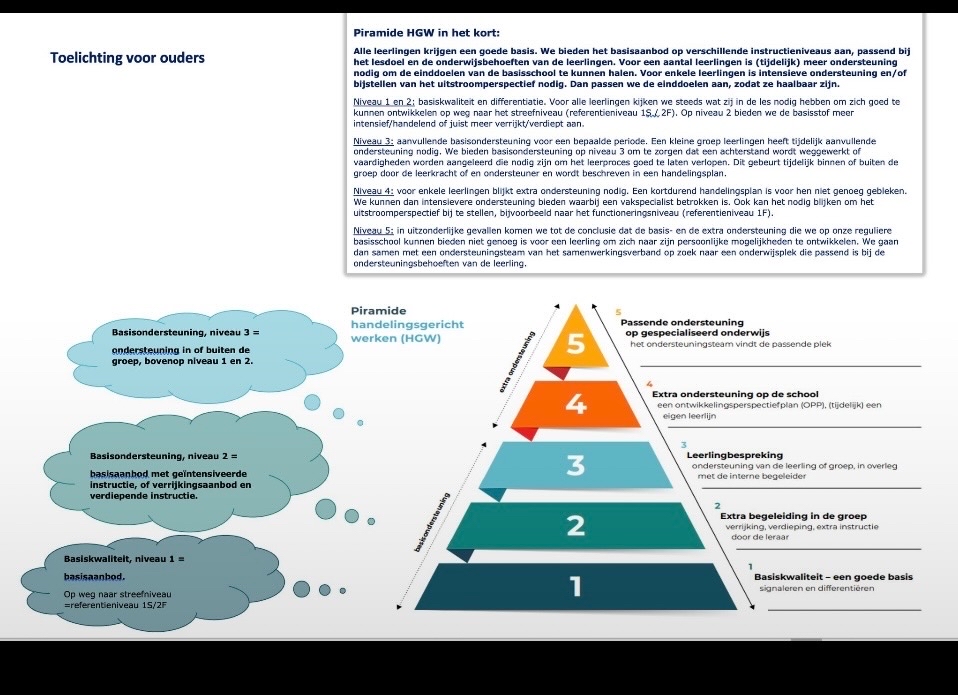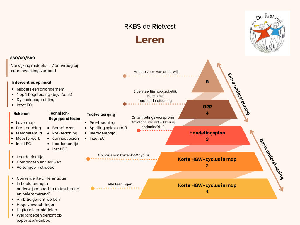 De basisondersteuning op RKBS De Rietvest is gebaseerd op het collectieve kader van ons samenwerkingsverband, het Samenwerkingsverband Passend Onderwijs Roosendaal-Moerdijk e.o. (SWV PO 3002). Het doel van dit samenwerkingsverband is om zorgleerlingen zo goed mogelijk te begeleiden en ondersteunen. Op de Rietvest geven we hier invulling aan op een manier die past bij onze visie op goed onderwijs: we werken opbrengstgericht en zetten sterk in op het versterken van het pedagogisch en didactisch handelen van onze leerkrachten. De ondersteuning start altijd in de groep, door de eigen leerkracht. Alles begint met het hebben van hoge verwachtingen van de leerlingen en het formuleren van ambities op schoolniveau. Deze vormen de basis voor het onderwijsaanbod en voor drie arrangementen die leerkrachten voor hun eigen groep vormgeven: basis, intensief en verdiept arrangement. Leertijd, leerstofdoelen, klassenmanagement en didactisch-pedagogisch handelen worden nauwkeurig afgestemd op de verschillende arrangementen. Zo krijgen alle leerlingen een passend aanbod dat aansluit op de schoolambities. Waar nodig wordt dit ondersteund door onze intern begeleider of andere specialisten binnen de school. Soms is er meer nodig dan deze basisondersteuning. In dat geval kunnen we een beroep doen op het Expertisecentrum van ons schoolbestuur, Stichting de Waarden. Als deze extra hulp wordt ingezet, stellen we een ontwikkelingsperspectief (OPP) op. Deze vorm van hulp noemen we breedte-ondersteuning en valt buiten de basisondersteuning. Om ons ondersteuningsaanbod voor ouders en andere betrokkenen helder weer te geven, hebben we een ondersteuningspiramide ontwikkeld en daarnaast een bijlage waarin ons ondersteuningsaanbod helder wordt weergegeven.